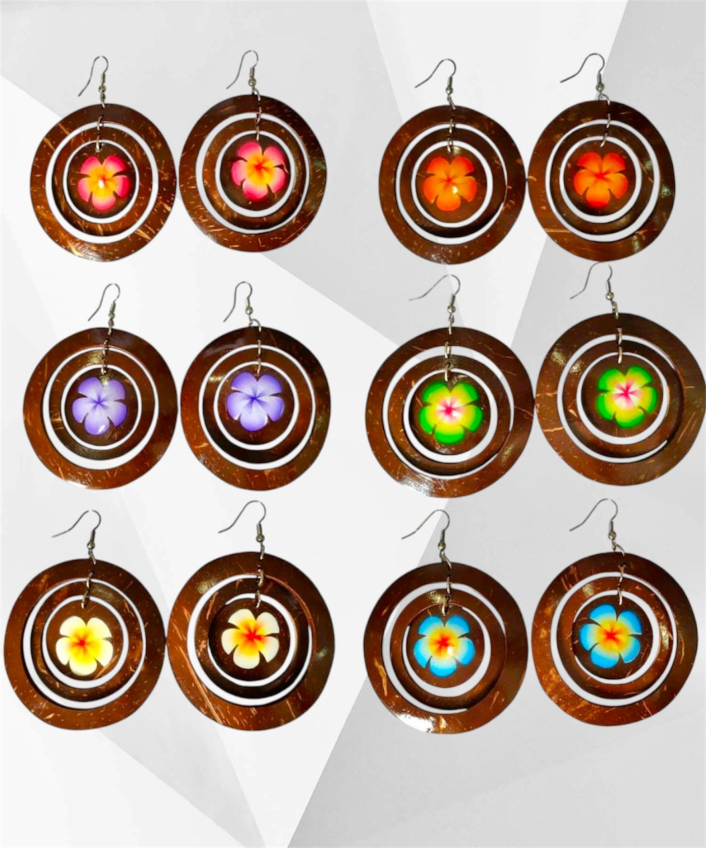 2.5 inch round coconut Ashley earrings with flower designs in assorted colors. Each pair features beautiful floral designs on natural coconut shell, available in a variety of vibrant color combinations.